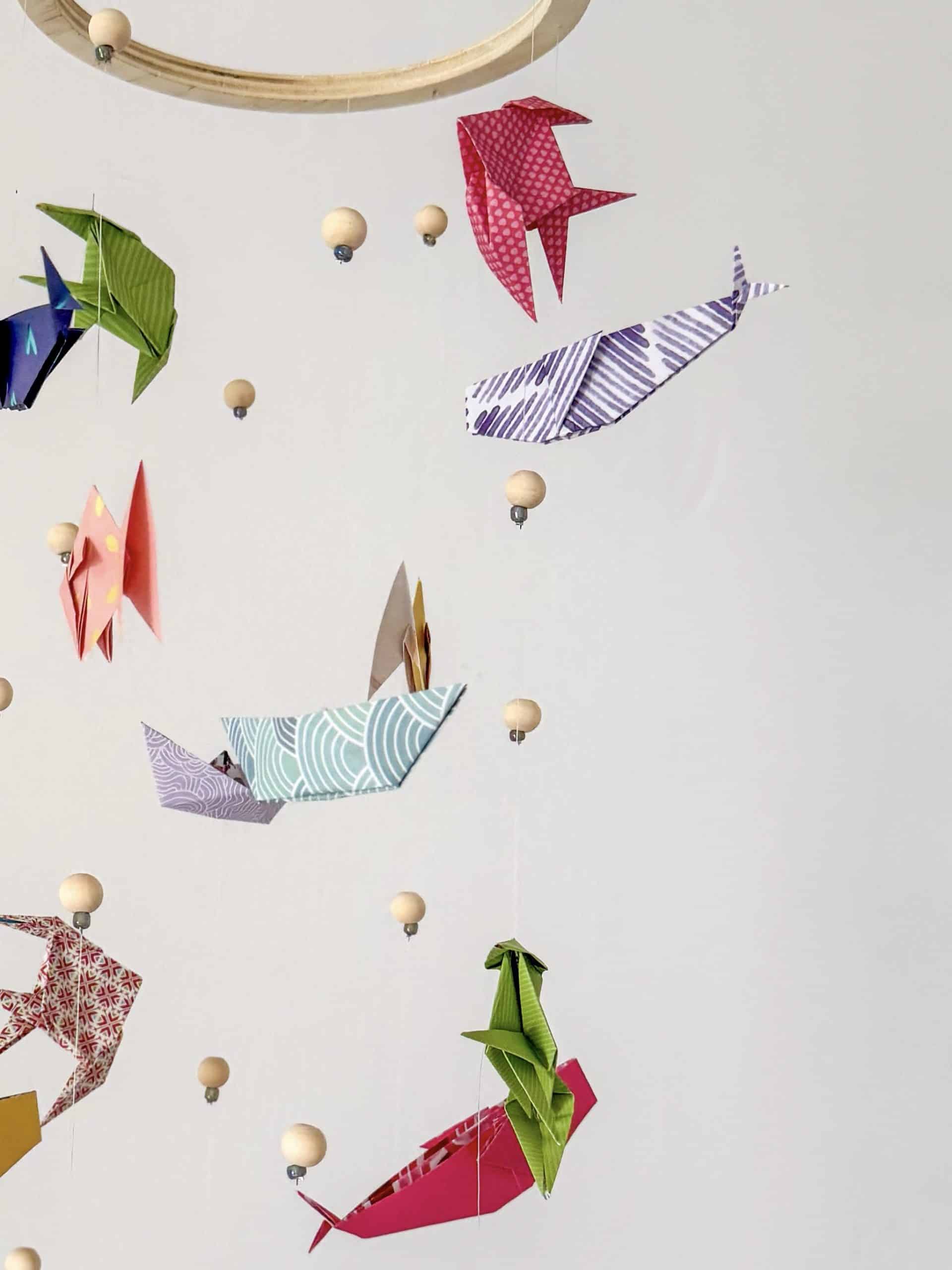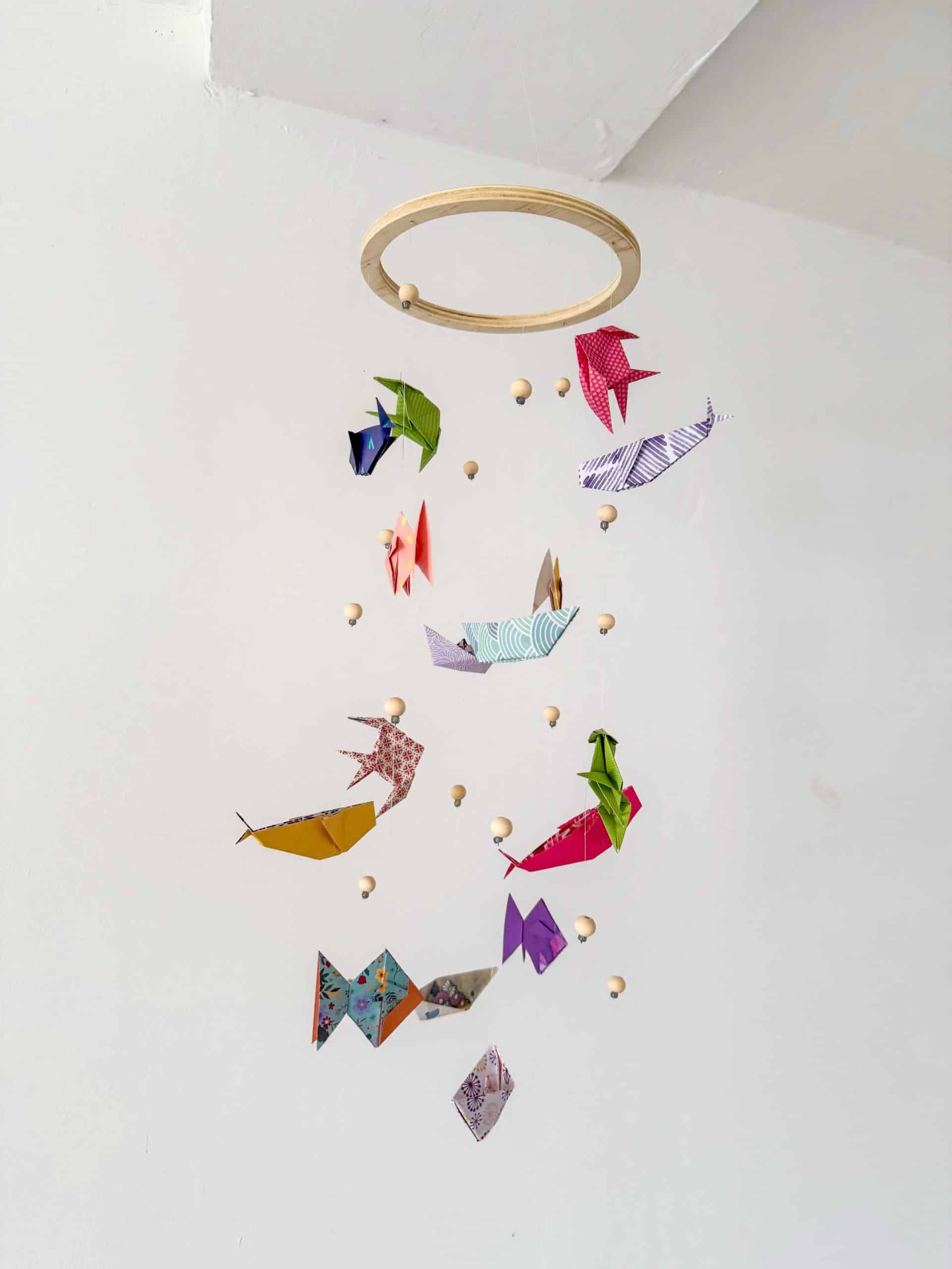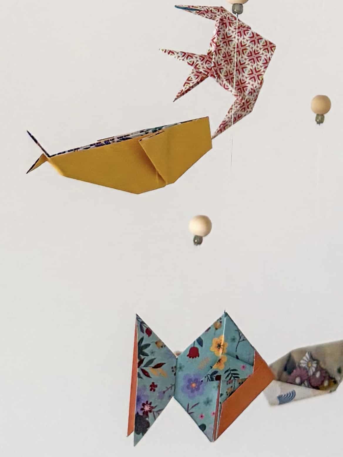 Mobile pour bébé en origami pliage océan, composé également de perles.